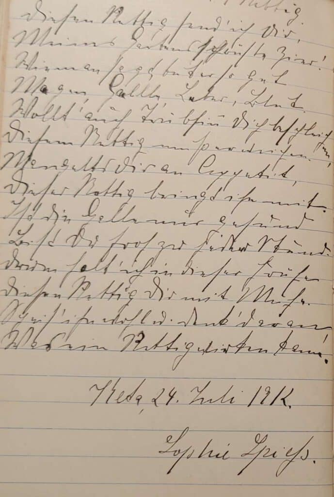 Sophie Spieß (*1875-†1968), geborene Schmidt, war die Ehefrau von Carl Spieß und mit ihrem Mann zusammen im Ewegebiet tätig. Dort übernahm sie u.a. die Leitung eines Kindergartens und einer Nähschule. Sophie Spieß schrieb in ihren „Täglichen Bemerkungen“ Tagebuch von ihren Erlebnissen und dem christlichen Gemeindeleben, außerdem schrieb sie humoristische Gedichte in das 93-seitige Büchlein.