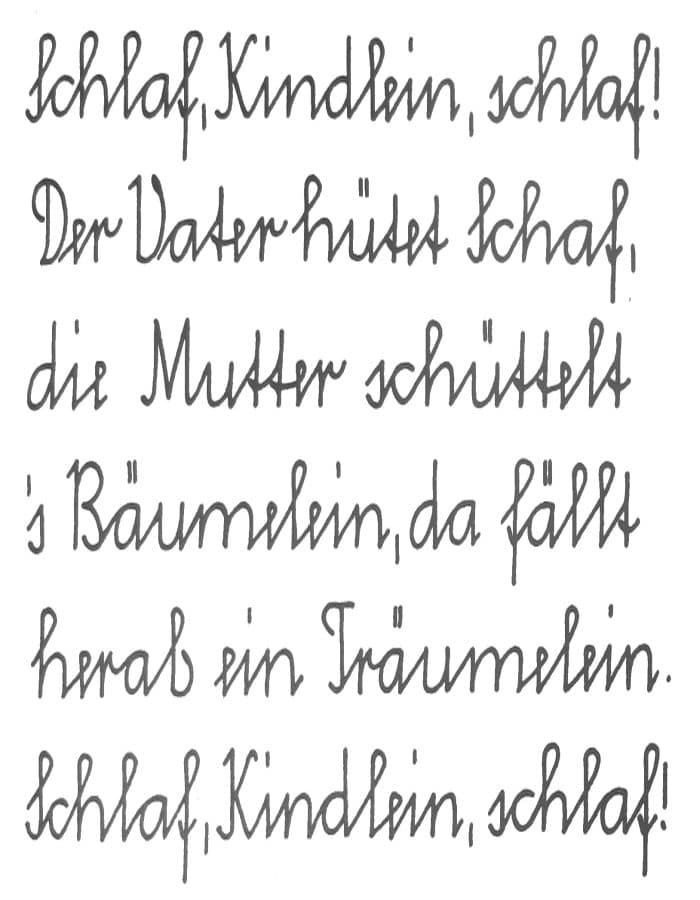 1911 von Ludwig Sütterlin im Auftrag des Preußischen Kultusministeriums entwickelte vereinfachte Version der Kurrentschrift. Im Unterschied zur Kurrentschrift ist die Sütterlinschrift durch die Erfindung der Gleichzugfeder (Kugelspitzfeder) auf ein Schriftbild mit gleicher Strichbreite ausgelegt. Sütterlin wurde von 1915 bis 1942 als Ausgangsschrift zum Erlernen von Schreibschrift in der Schule gelehrt. Durch den Normalschrifterlass Hitlers wurde sie 1941 vom NS-Regime abgeschafft.